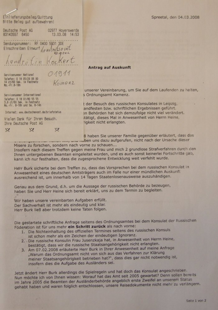 Die übereifrigen Versuche seitens des Ordnungsamtes Kamenz, uns nach 16 Jahren die russische Staatsangehörigkeit zu verschaffen, sind mehr als bedenklich. Diese „mütterliche Fürsorge“ wäre